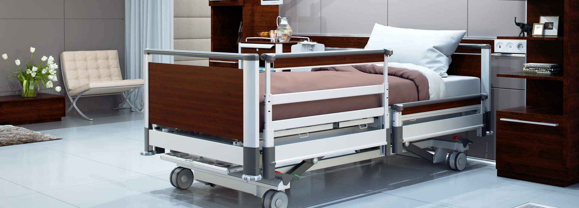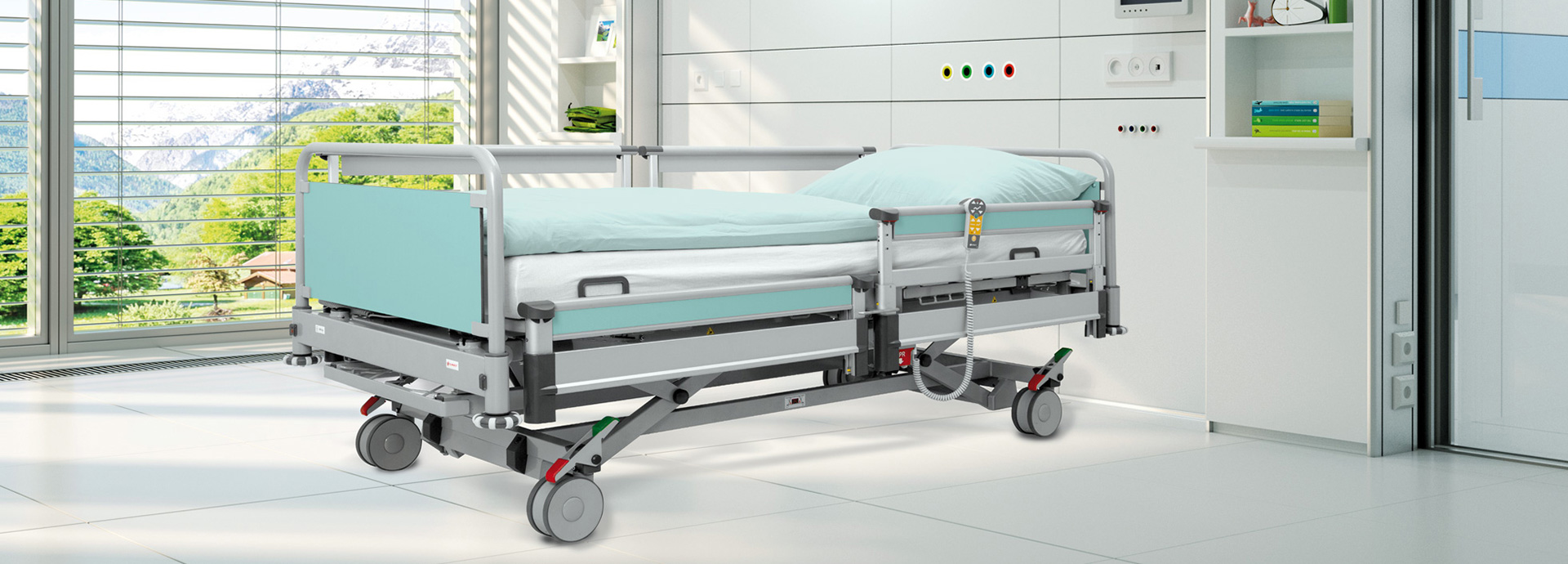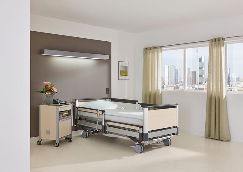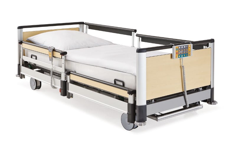 Das elektrisch verstellbare Bett image 3 vereint 2 Betten in Einem – Universalklinikbett und Niedrigklinikbett. Damit trägt es auch den zukünftigen Herausforderungen von immer älter werdenden Patienten Rechnung.