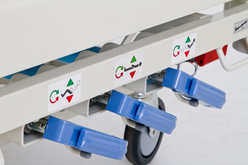 The backrest and thigh rest can be adjusted by a crank mechanism and the calf rest can be adjusted by using a handle. Praktika 2 can also be adjusted to the TR/ATR position and allows height adjustment of the mattress platform by using the third crank.