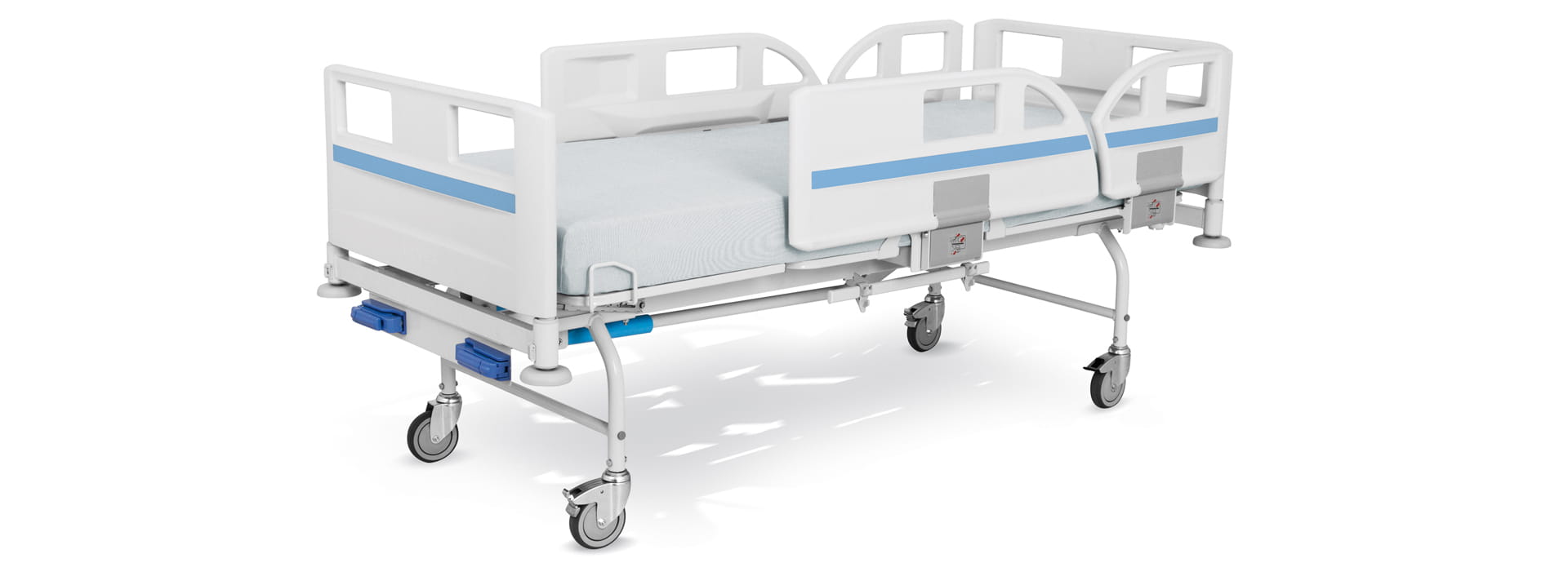 Praktika 1 and 2 is a universal mechanically operated hospital bed with an attractive modern design and a 4-section mattress platform with either fixed height (Praktika 1) or adjustable height (Praktika 2). Praktika 1 and 2 is a high quality medical bed made by trustworthy European manufacturers with the use of modern technologies.