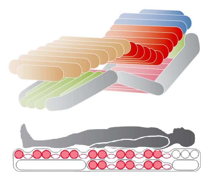 With the virtuoso ICU mattress, the cells can be deflated on the head or heel areas for procedures such as intubations or for pressure relief on specific sensitive areas of the body.
