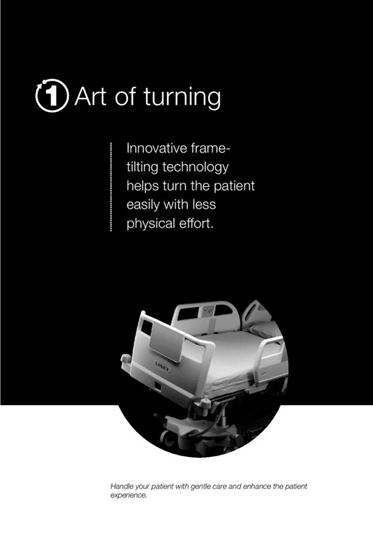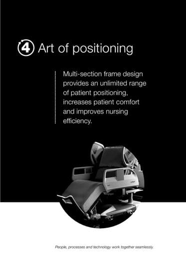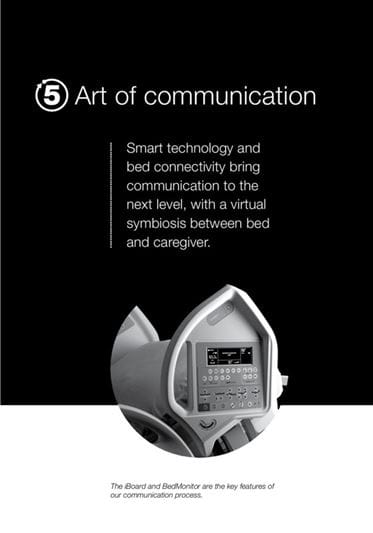 “The number five is an expression of the five fundamental benefits of the new bed, which in the campaign we’ve identified as five types of art,” explains Ms Hrozinková. “The first is the Art of turning, i.e., the possibility to use the bed’s lateral tilt function to simplify handling of immobile patients. The second is the Art of safety, which emphasises the bed’s safety features. The third is the Art of mobilisation, which illustrates how the bed contributes to faster recovery. The fourth is the Art of positioning, which highlights the bed’s 3D positioning ability for therapeutic, examination, and preventive purposes. The fifth is the Art of communication, which represents the use of modern technologies in the transfer of information about the bed’s safety and technical state between the bed and the hospital’s information system. We’ve entitled this entire complex of services the Art of nursing, as the bed itself serves as a nurse in its own right,” says Ms Horzinková.