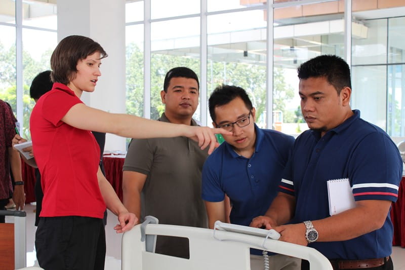The participants put the active mattresses to the test and also took turns handling our beds, which gave them real insight into the degree of comfort these products afford nurses and patients during daily use. They were introduced to basic sales principles and arguments in order to be prepared to present the unique characteristics of our beds to their customers. A group of service technicians from all of the countries of the region gained important knowledge and, thanks to practical tutorials, hands-on experience in the correct servicing and maintenance of our beds to keep them in top technical condition.