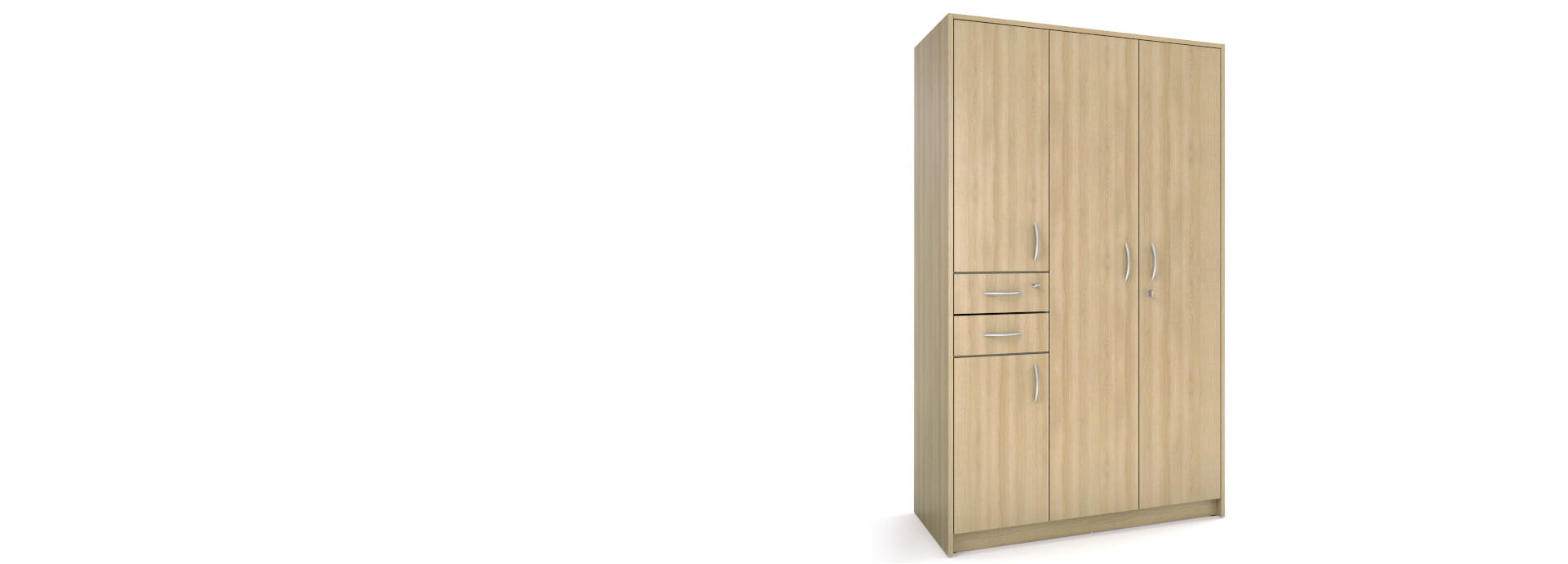 One person wardrobe with 3 doors, clothes rail and shelves The wardrobe offers a lot of storage space and can be easily opened and closed by the resident thanks to the 128 mm curved segment handles. The integrated drilled soft-close reduces the noise level when closing the doors. A valuables compartment can be integrated at different heights. This way, it is also optimally accessible for persons in a wheelchair.