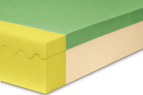 Der Matratzenkörper besteht aus einer Kombination von zwei Schichten: einer Liegefläche mit viskoelastischem Schaum und einer Stützschicht aus Kaltschaum.