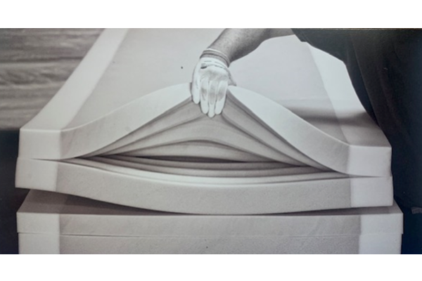 Der Matratzenbezug ist aus PERLASTIC® Silberbezug dunkelgrau mit verdecktem L-Reißverschluss und zwei Griffen an einer Seite.