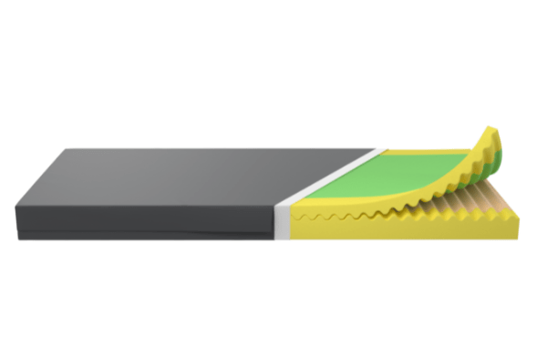 Wellen-Konturschnitt: 2 nicht verklebte Schaumstoffschichten. Dies ermöglicht eine gleichmäßige Verteilung des Auflagedrucks ohne harte Nähte und sorgt für eine höhere Druckentlastung.