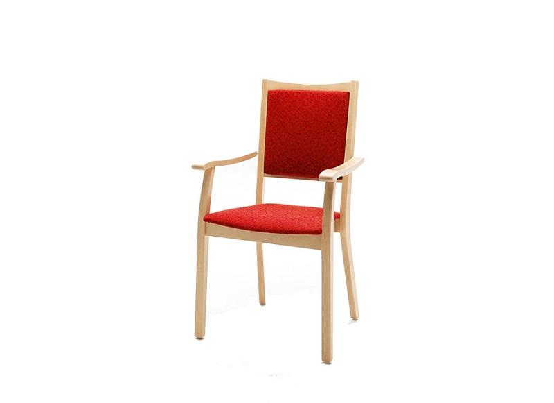 A chair with a longer back rest, arm rest and straight profiles. High sitting comfort due to the upholstered seating and back area. The stable frame is made of lacquered solid wood. Moreover, the chair is stackable.