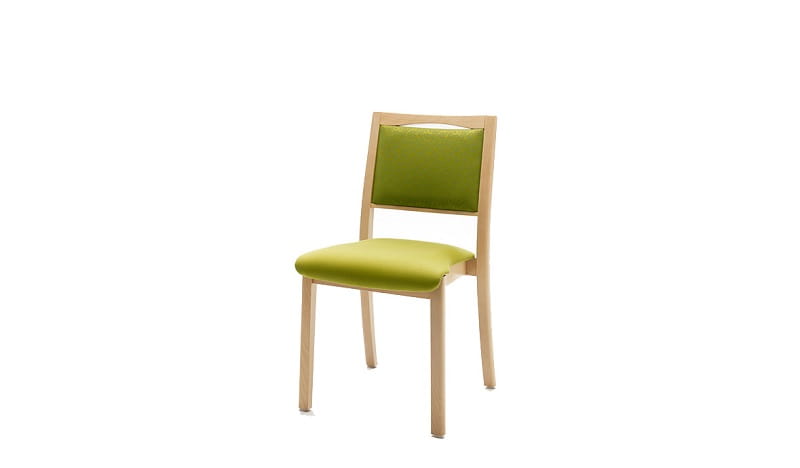 Chair with rounded profiles and comfortably upholstered seating and back area. The stable frame is made of lacquered solid wood. Moreover, the chair is stackable. The gap on the back can be used as a handle.