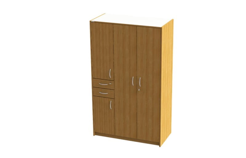 One person wardrobe with 3 doors, clothes rail and shelves The wardrobe offers a lot of storage space and can be easily opened and closed by the resident thanks to the 128 mm curved segment handles. The integrated drilled soft-close reduces the noise level when closing the doors. A valuables compartment can be integrated at different heights. This way, it is also optimally accessible for persons in a wheelchair.